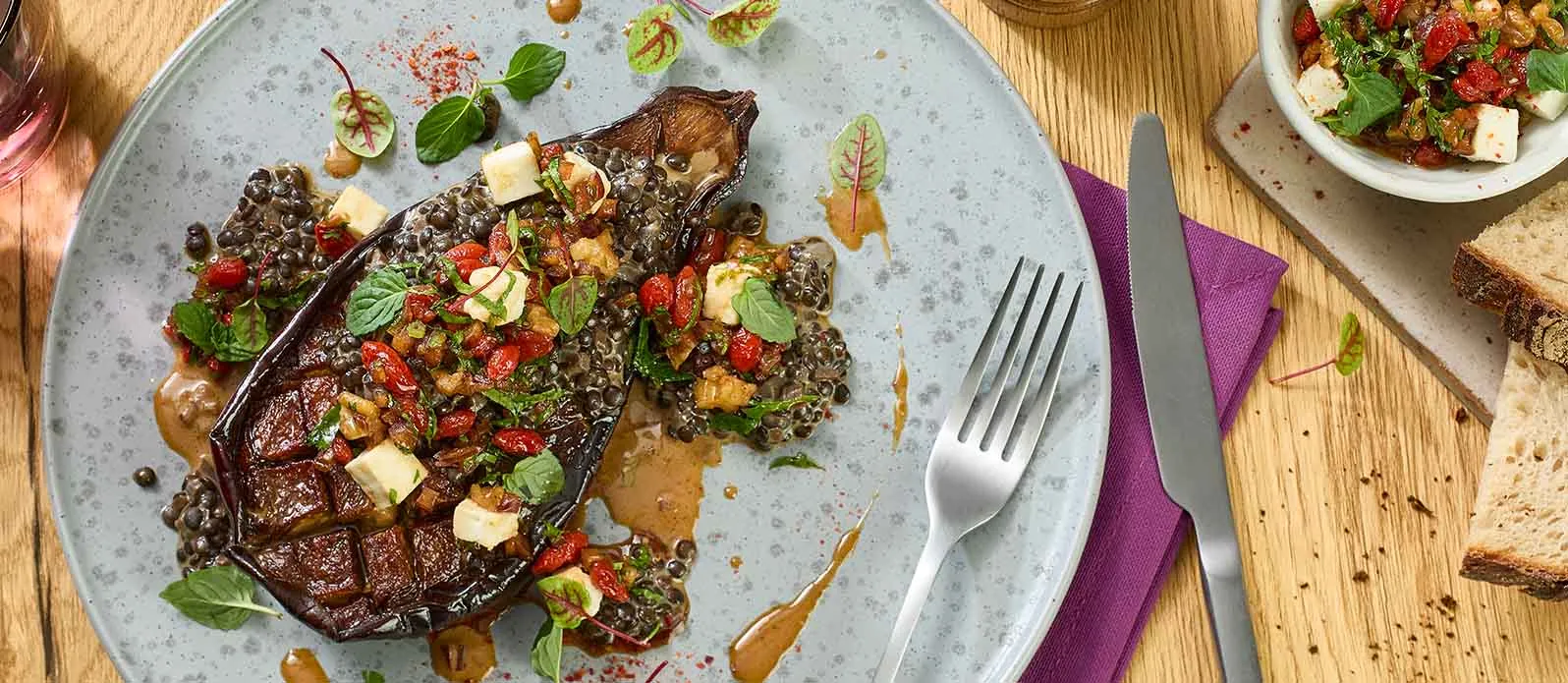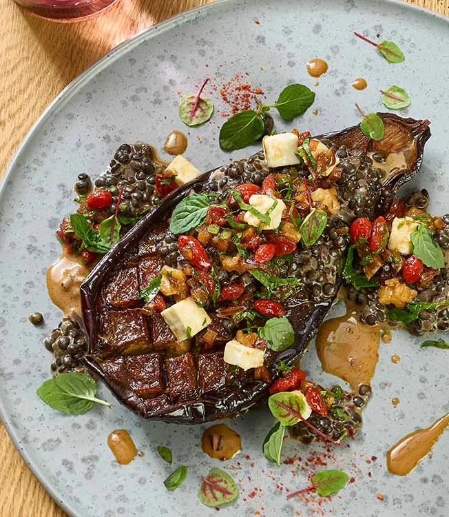 Для подготовки перед подачей баклажаны можно заранее покрыть чечевицей и позже разогреть в духовке или пароконвектомате. Прямо перед подачей на стол добавьте годжи и кресс-салат.