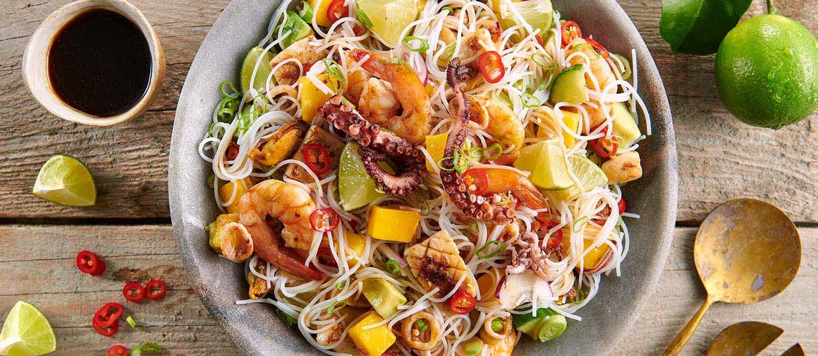 С рисовой лапшой, морепродуктами, кукурузой и авокадо, это, столь любимое многими, блюдо стритфуда готовится очень быстро благодаря соусу Поке Kikkoman.