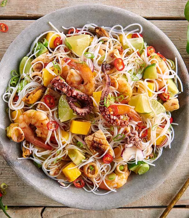 Боул: Приправьте морепродукты солью и перцем, сбрызните соком лайма и слегка обжарьте на очень сильном огне. Разрежьте пополам и нарежьте огурцы, а лук нарежьте тонкими кольцами. Очистите и нарежьте кубиками авокадо и манго. По желанию: слейте воду с кукурузы. Приготовьте рисовую лапшу по инструкции, затем нарежьте ее покороче.