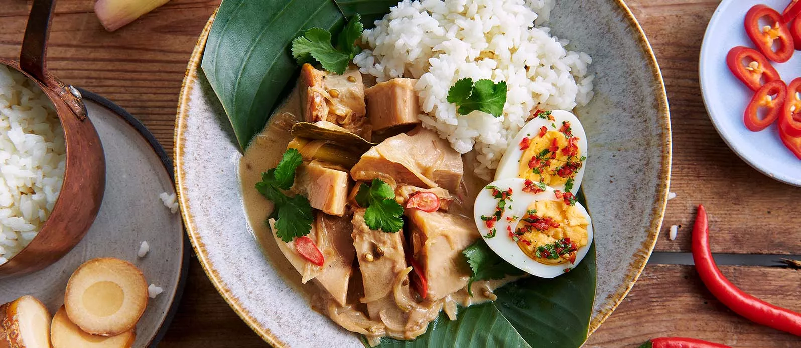 Джекфрут — невероятно универсальный и модный вегетарианский ингредиент. В этом экзотическом рагу он отлично сочетается с лемонграссом и чаем, а кислинка соуса Понзу Kikkoman Лимон прекрасно завершает вкусовую композицию.