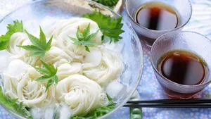 Лапша сомен очень нежная, белая и длинная, и для ее приготовления берется пшеничная мука, немного соли и воды. Она тоньше лапши удон. Очень вкусной эта нитевидная лапша становится, если ее сервировать холодной с соусами, класть в рыбный бульон (даши) с соевым соусом и свежим имбирем. Летом, в жаркую погоду, это одно из популярных блюд.