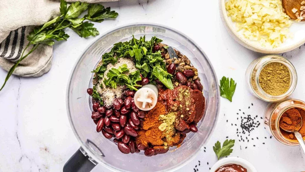 Сварите чечевицу с 1 стаканом воды. Мелко нарежьте лук и чеснок. Смешайте в миске чечевицу без жидкости, фасоль, томатное пюре, соевый соус, специи, овсяные хлопья и псиллиум. Немного взбейте в блендере. Добавьте рубленую петрушку и перемешайте.