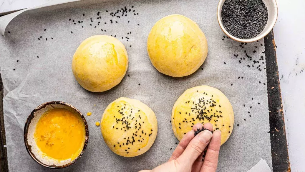 Смешайте муку, дрожжи, сахар, яйцо, соль и воду в миске и начните замешивать тесто. Добавьте масло и месите, пока тесто не станет гладким и мягким, затем оставьте подниматься. Сформируйте из теста 4 булочки, смажьте их взбитым яйцом и посыпьте кунжутом. Дайте подняться вдвое в теплом месте. Затем выпекайте булочки в предварительно разогретой духовке при 200°C около 15 минут.