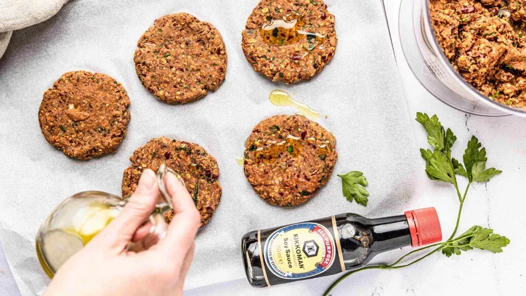 1 небольшая луковица – 1 зубчик чеснока – 40 г зеленой чечевицы – 200 г консервированной красной фасоли – 1 ст. л. томатного пюре – 1 ст. л. соевого соуса натурального брожения Kikkoman – 1 ч. л. паприки – ½ ч. л. зиры – 25 г овсяных хлопьев – 1 ст. л. псиллиума – 1 ст. л. рубленой петрушки