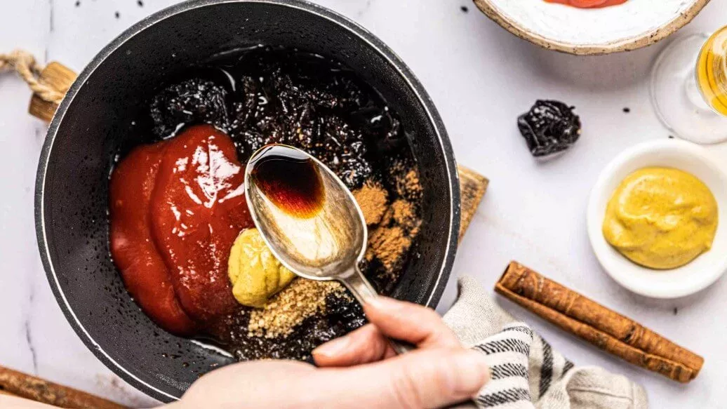 50 мл воды – 50 г копченых слив – 1 ч. л. уксуса – 1 ч. л. коричневого сахара – 1 ст. л. соевого соуса натурального брожения Kikkoman – ½ ч. л. горчицы – ½ ч. л. корицы – ¼ ч. л. порошка чили – 50 г кетчупа – 15 мл бренди