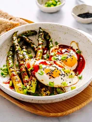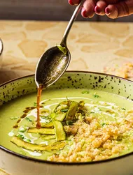 Выдавить мякоть чеснока из всех зубчиков. Ложкой вынуть мякоть баклажана и пюрировать с чесноком, оставшимся растительным маслом, соевым соусом, соком лайма и петрушкой. Добавить по вкусу перец и чили и подать блюдо.
