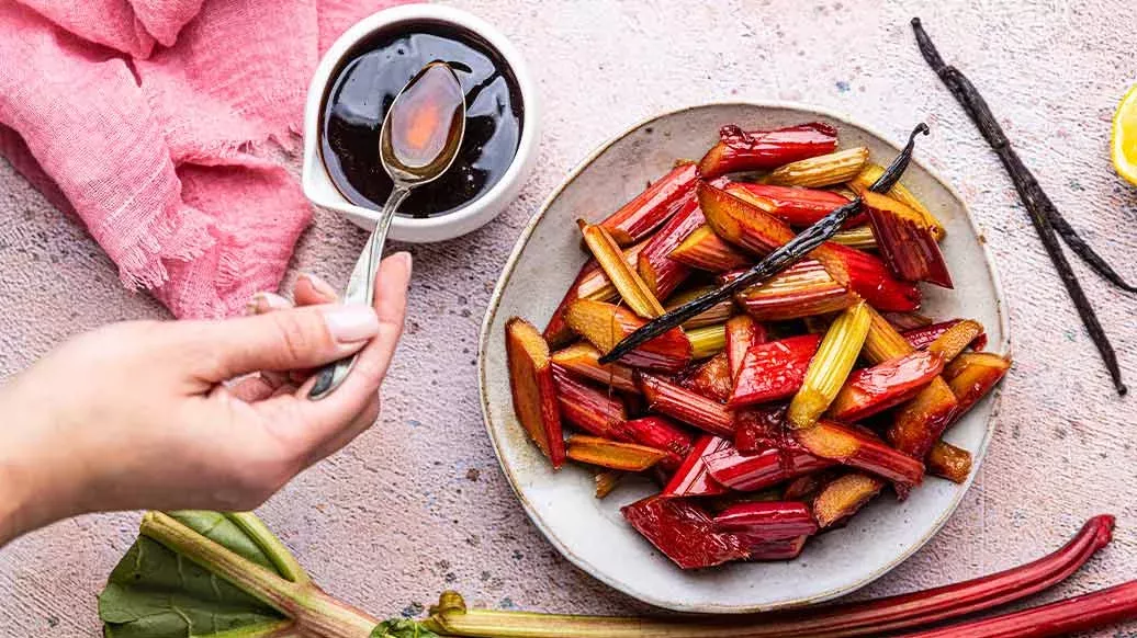 500 г ревеня – 150 г сахара – 80 мл воды – 2 ст. л. слабосоленого соевого соуса натурального брожения Kikkoman – 1 ст. л. лимонного сока – 1 стручок ванили