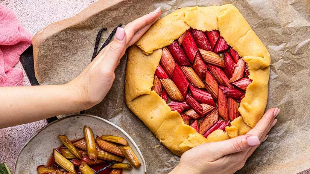 Раскатайте тесто. Положите ревень в центр и загните края теста. Выпекайте в предварительно разогретой духовке при 200°C около 30-35 минут.
