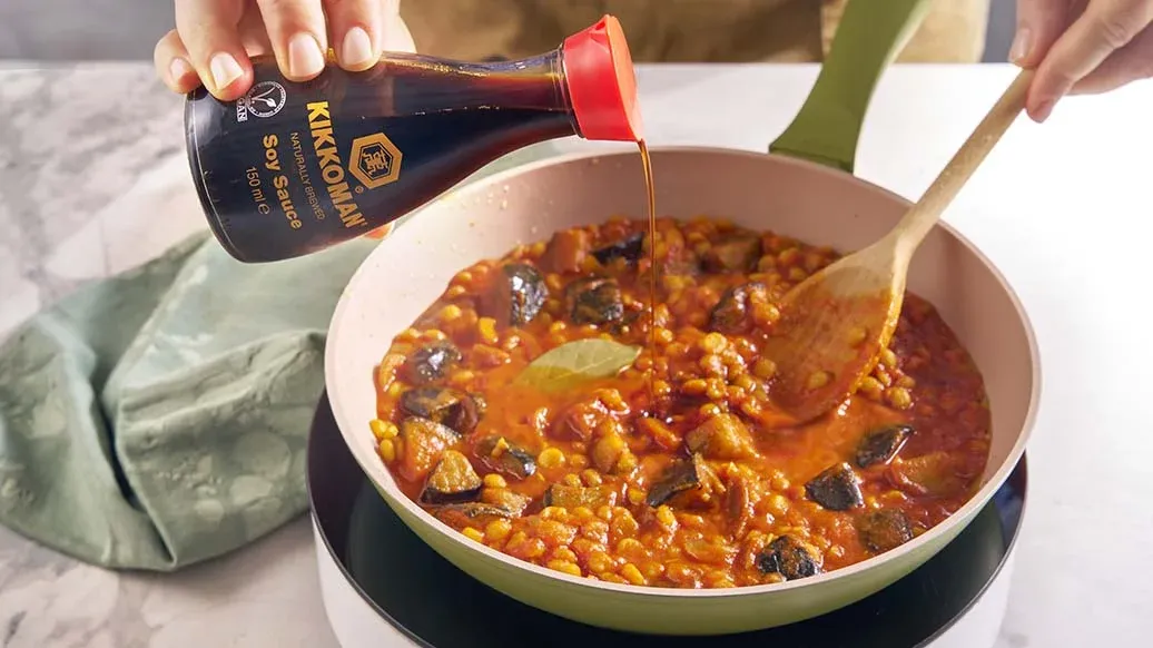 Чана дал, тушеный с баклажанами и жареным чесноком, с землистыми, дымными специями и соевым соусом Kikkoman, подается со свежим чесночным нааном и кинзой.