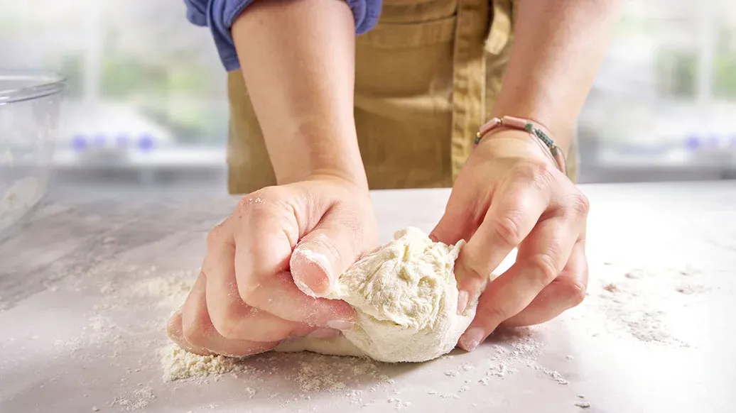 200 г пшеничной муки – 20 г дополнительной муки для посыпки – ½ ч. л. разрыхлителя – ½ ч. л. пищевой соды – 40 мл теплого молока – 75 г йогурта