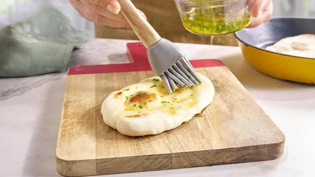 Нагрейте сухую сковороду на среднем огне и обжарьте каждую лепешку по 2 минуты с каждой стороны, пока не появятся золотистые пузырьки и следы подгорания. В маленькой кастрюле растопите гхи, затем добавьте измельченный чеснок и кинзу. Нарежьте лук кольцами. Смажьте наан чесночным маслом и подавайте с далом и луком. Украсьте свежими листьями кинзы.