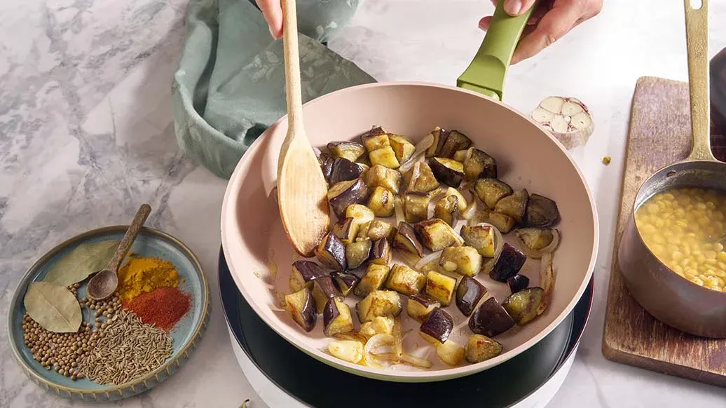 Срежьте верхнюю часть головки чеснока, чтобы обнажить зубчики. Смажьте чеснок маслом и запекайте в духовке около 30 минут (180°C). Отварите чана дал в овощном бульоне 40 минут. В сковороде обжарьте лук и баклажан в топленом масле 5 минут до золотистого цвета, затем добавьте запеченный чеснок. Добавьте зиру, куркуму, семена кориандра, копченую паприку и лавровый лист и обжарьте 10–15 секунд, до аромата.