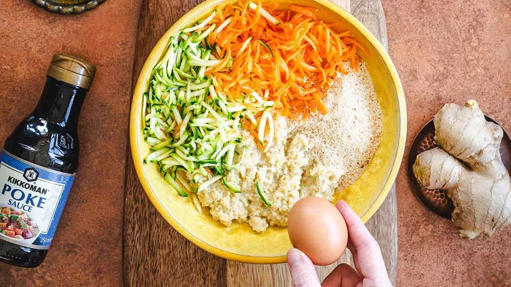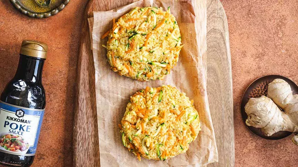Приправьте смесь специями, имбирем и соусом Поке Kikkoman. Сформируйте 2 котлеты и обжарьте их с обеих сторон на оливковом масле.