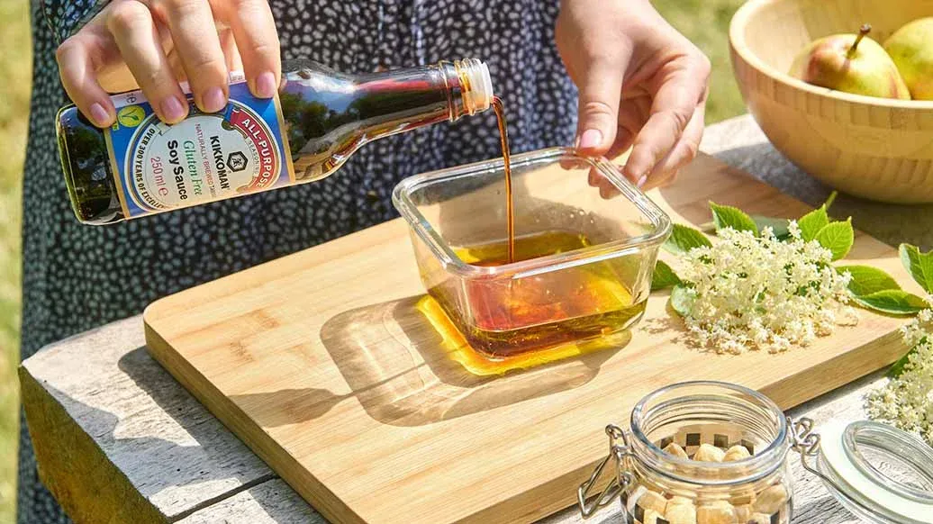 Взбейте вместе сироп бузины, оливковое масло, белый винный уксус и безглютеновый соевый соус Kikkoman в небольшой миске. Приправьте свежемолотым чёрным перцем.