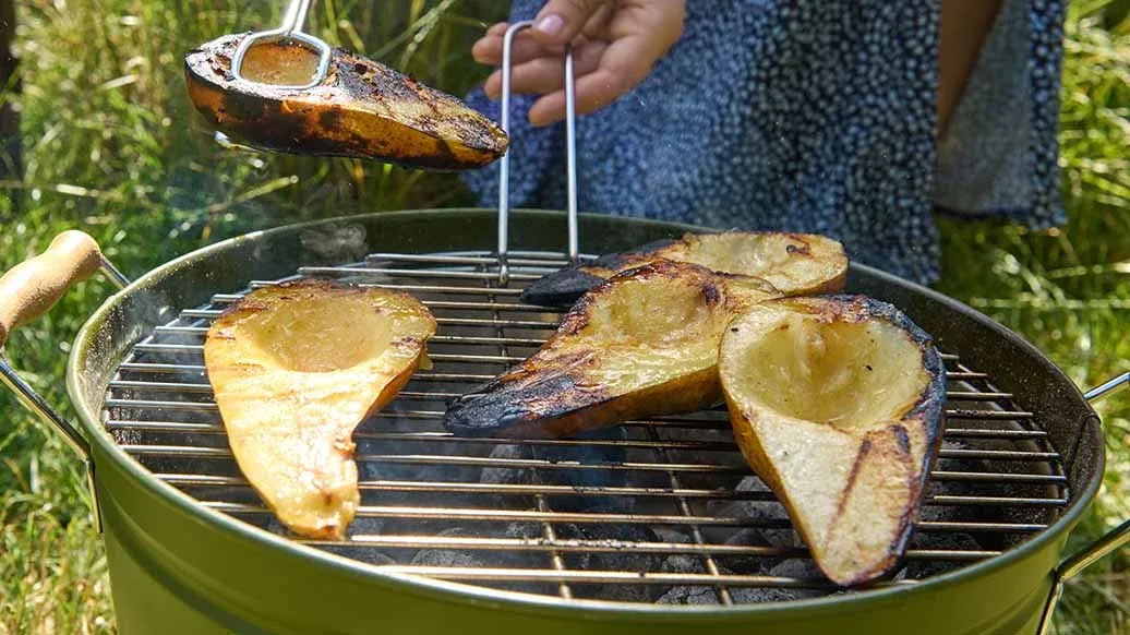 2 спелые груши, разрезанные пополам и очищенные от сердцевины – 15 мл оливкового масла – 50 г горгонзолы, раскрошенной – 25 г фундука, обжаренного и измельченного – 10 г листьев свежей мяты