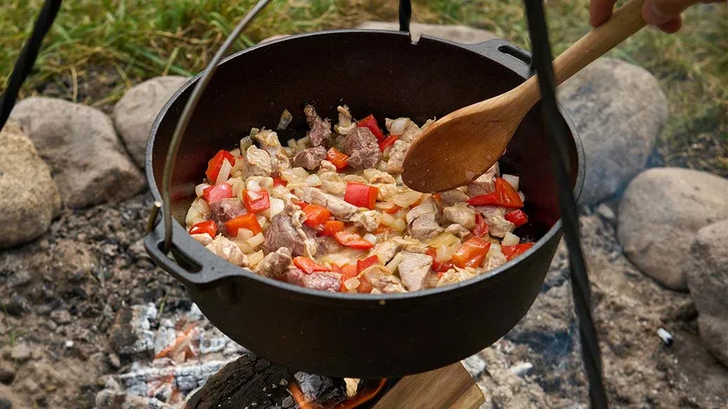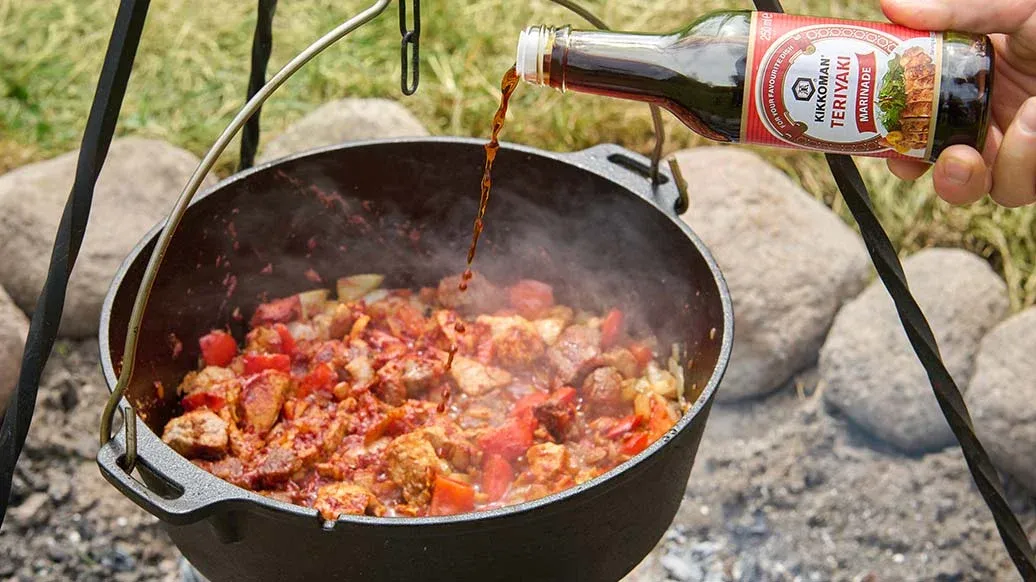 Добавьте томатное пюре, паприку и зиру и готовьте еще минуту. Влейте говяжий или овощной бульон и доведите до кипения. Варите 35–40 минут, или пока мясо не станет нежным. Приправьте суп маринадом Терияки Kikkoman. Подавайте гуляш горячим, украсив его фетой, маслинами, дольками лимона и петрушкой.