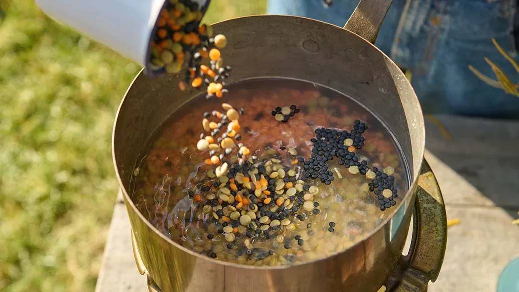 150 г смеси чечевицы (например, красной, желтой и зеленой), промытой – 400 мл овощного бульона или воды