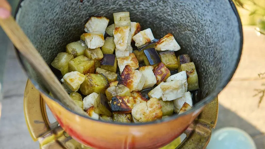 Разогрейте оливковое масло в отдельной жаровне на среднем огне. Добавьте нарезанный кубиками баклажан и жарьте, периодически помешивая, в течение 8–10 минут до мягкости и легкой румяности. Выньте баклажан из жаровни и отложите в сторону. В ту же жаровню добавьте ещё 1 ст. л. оливкового масла, если необходимо. Добавьте нарезанный кубиками сыр Халуми и обжаривайте в течение 4–5 минут до золотистого цвета со всех сторон. Тоже выньте из жаровни и отложите в сторону.