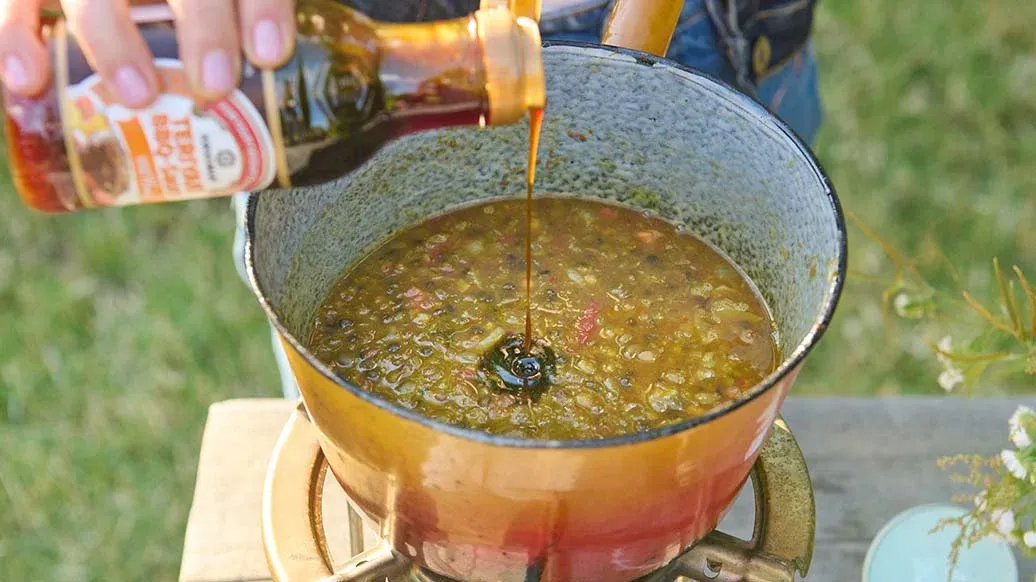 Добавьте оставшуюся 1 ст. л. масла в ту же жаровню. Добавьте рубленый лук и жарьте 3–4 минуты до мягкости и полупрозрачности. Добавьте рубленый чеснок и имбирь и готовьте еще 1–2 минуты до аромата. Добавьте нарезанные кубиками помидоры, зиру, кориандр, куркуму и порошок чили. Готовьте 2–3 минуты, постоянно помешивая, пока специи не обжарятся и не дадут аромат. Добавьте готовую чечевицу в жаровню вместе с оставшейся жидкостью. Перемешайте, чтобы смесь специй хорошо смешалась с чечевицей. Приправьте барбекю-соусом Терияки Kikkoman c медом и соевым соусом Kikkoman и тушите еще 5–10 минут, чтобы ароматы перемешались. Подавайте дал в глубоких суповых тарелках, добавив жареные баклажан, халуми и кинзу.