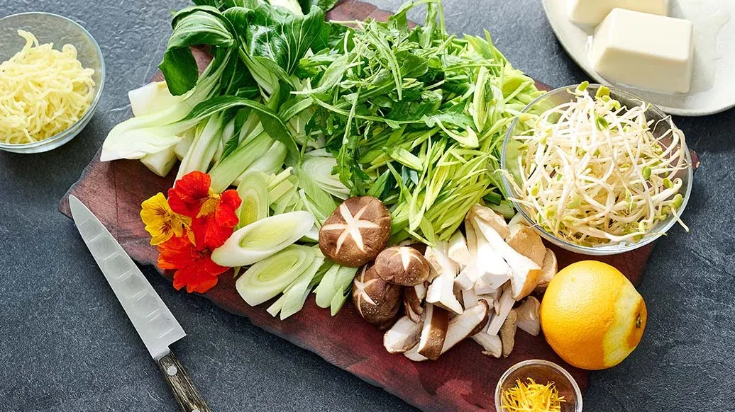 200 г грибов (например, эноков, королевских вешенок, шиитаке) – 200 г руколы – 150 г проростков фасоли – 2 лука-порея – 2 кочана капусты пак-чой – 300 г тофу