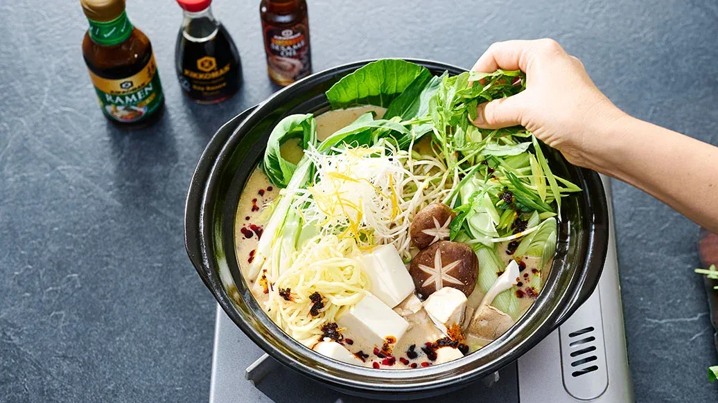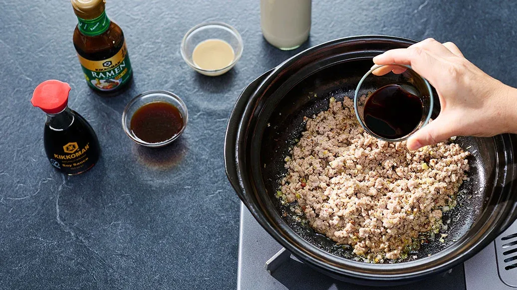 Нагрейте кунжутное масло Kikkoman в кастрюле. Добавьте измельчённый чеснок, имбирь, белую часть лука-порея из шага 1, сычуаньский перец и измельчённый перец чили и перемешайте до появления аромата. Добавьте мясной фарш и готовьте до появления румяной корочки. Добавьте тахини, соевый соус Kikkoman, основу Kikkoman для супа Рамен, соль и соевое молоко. Хорошо перемешайте.