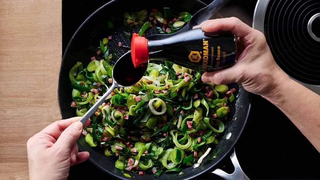 Нарежьте лук-порей кольцами. Обжарьте нарезанный кубиками бекон на сковороде с антипригарным покрытием. Добавьте лук-порей и жарьте около 10 минут. Приправьте соевым соусом Kikkoman.
