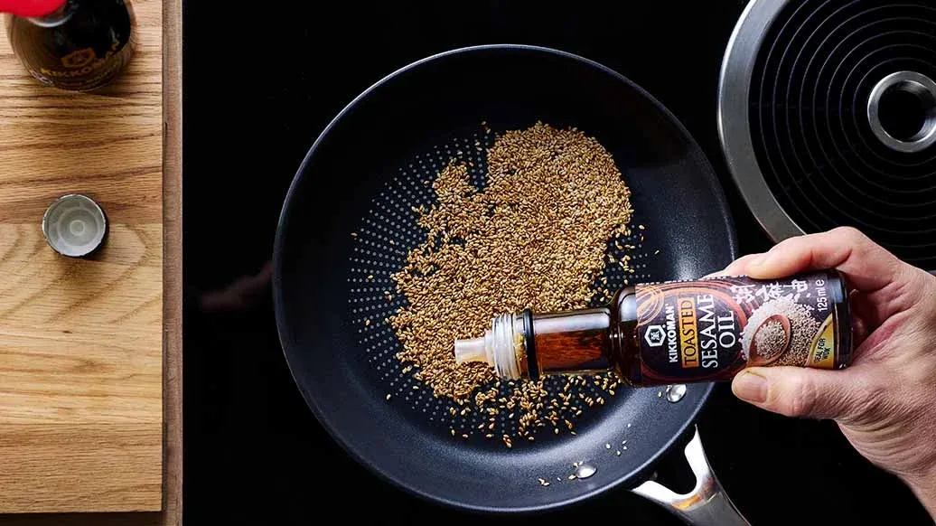 2 ст. л. семян кунжута – 2 ст. л. масла Kikkoman из поджаренного кунжута – 2 ст. л. соевого соуса натурального брожения Kikkoman