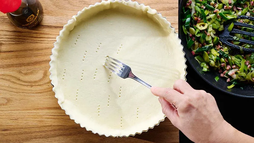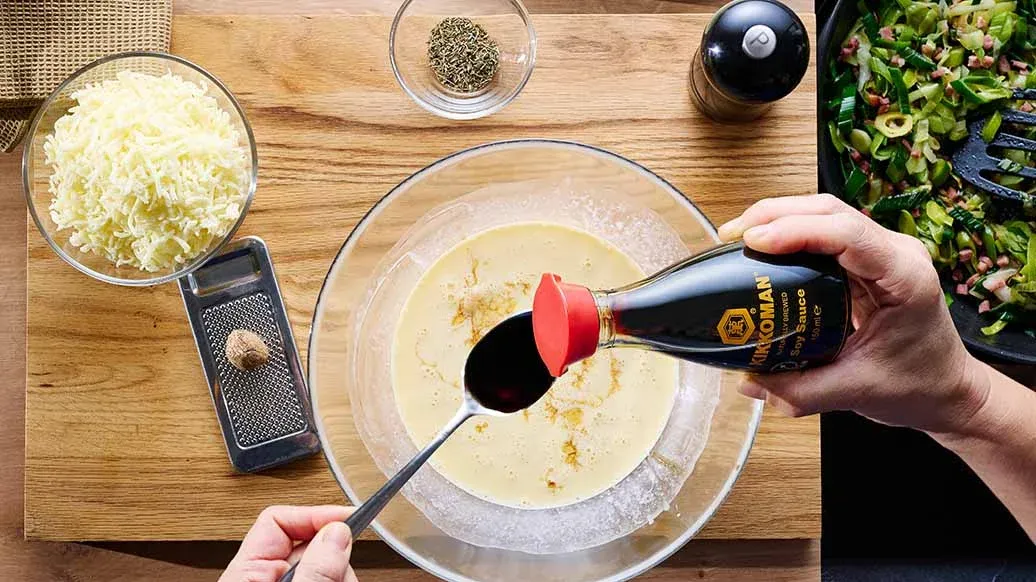 Французская классика в современном исполнении: лук-порей, копчёный бекон и тимьян идеальны с яйцами, сливками и соевым соусом Kikkoman в насыщенном и пикантном тарте, вкусном и в горячем, и в холодном виде.
