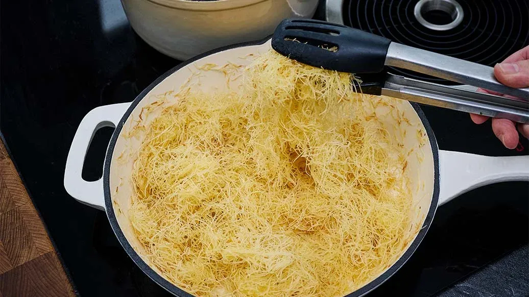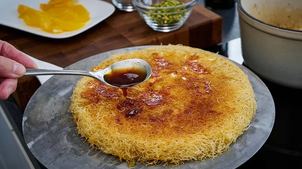 Поставьте сковороду на слабый или средний огонь и готовьте 3–5 минут, пока нижний слой не станет золотистым. На сковороду положите тарелку, крепко придерживая, переверните сковороду, чтобы кюнефе аккуратно улёгся на тарелку. Затем верните катаифи в сковороду, поджаренной стороной кверху и готовьте еще 2–4 минуты, пока вторая сторона не станет золотистой.
