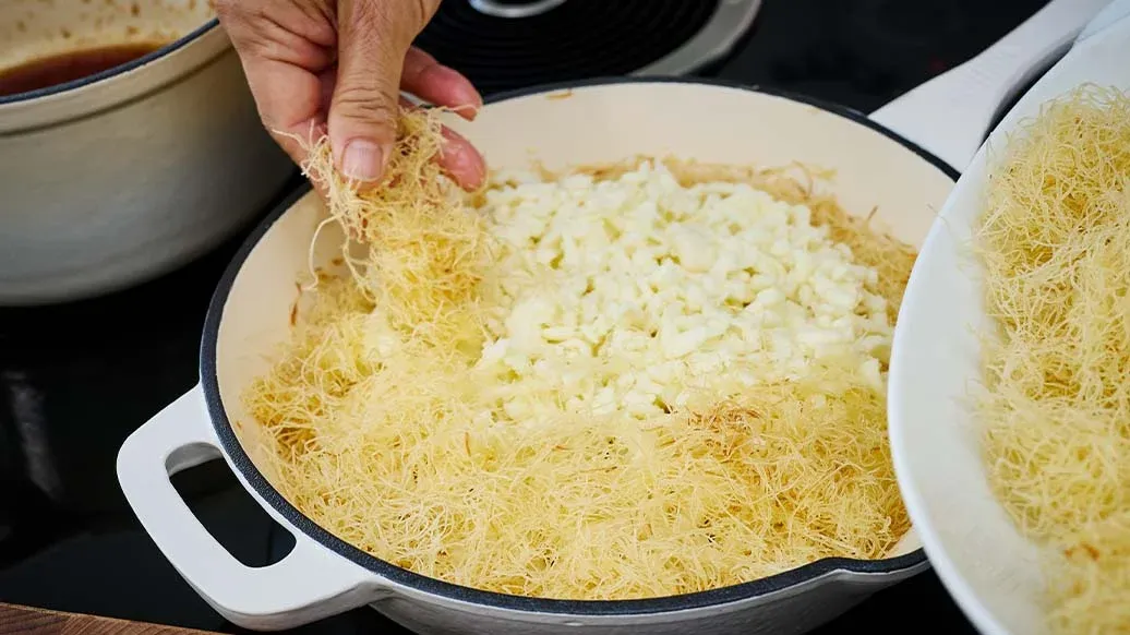 Растопите сливочное масло, затем тщательно смешайте с тестом катаифи, пока тесто не будет равномерно покрыто маслом.