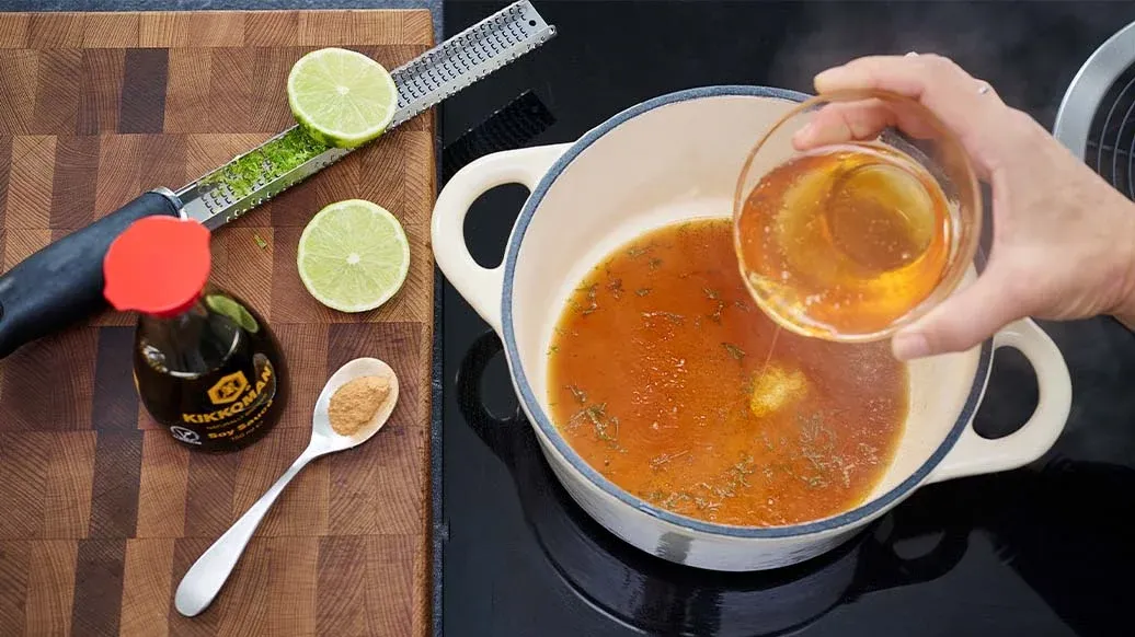 Мелко натрите цедру лайма, затем разрежьте его пополам и выжмите сок. Положите цедру и сок в небольшую кастрюлю с мёдом, соевым соусом Kikkoman, корицей и примерно 75 мл воды. Варите на маленьком огне 3–5 минут, затем добавьте розовую воду по желанию.