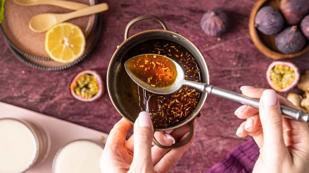 2 ст. л. кленового сиропа – ½ безглютенового соевого соуса Tamari Kikkoman – 1 ч. л. свежего тёртого имбиря – 1 ч. л. лимонного сока – 2 инжира – 1 маракуйя – 1 ч. л. кокосовой стружки – Листья мяты для украшения