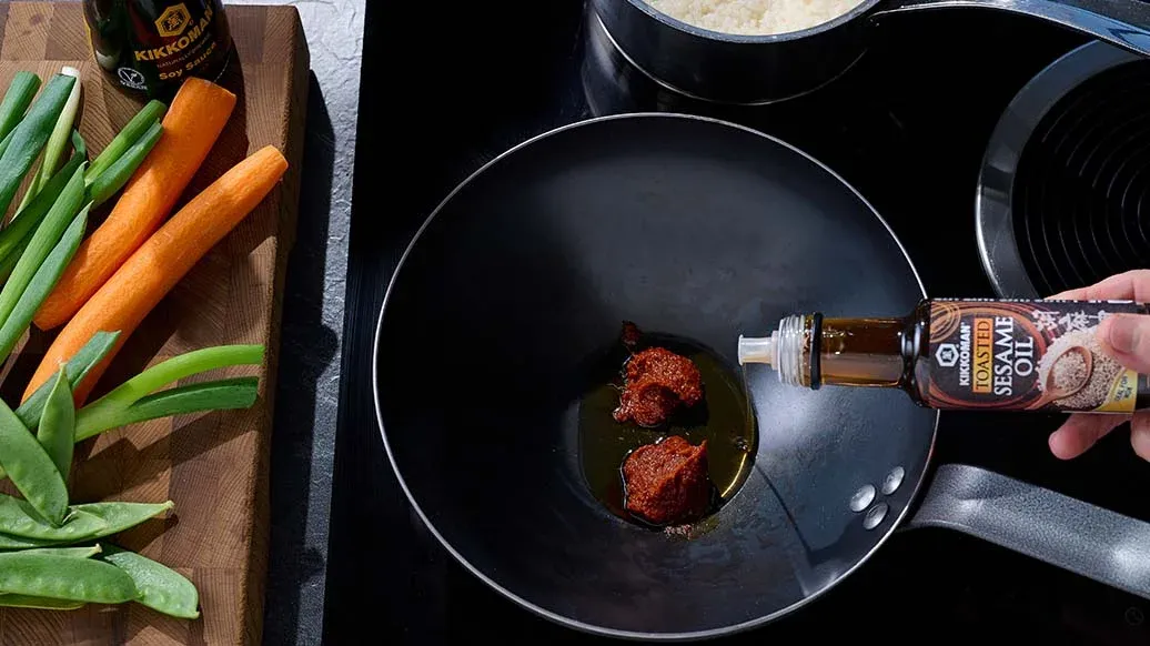 200 г риса, например, Басмати – 500 г филе куриной грудки – 2 красных болгарских перца – 1 пучок зелёного лука – 2 моркови – 200 г молодого стручкового гороха (или замороженного гороха или стручковой фасоли) – 2 ч. л. красной пасты карри – 2 ст. л. масла Kikkoman из поджаренного кунжута – 400 мл кокосового молока – 75 мл соевого соуса натурального брожения Kikkoman