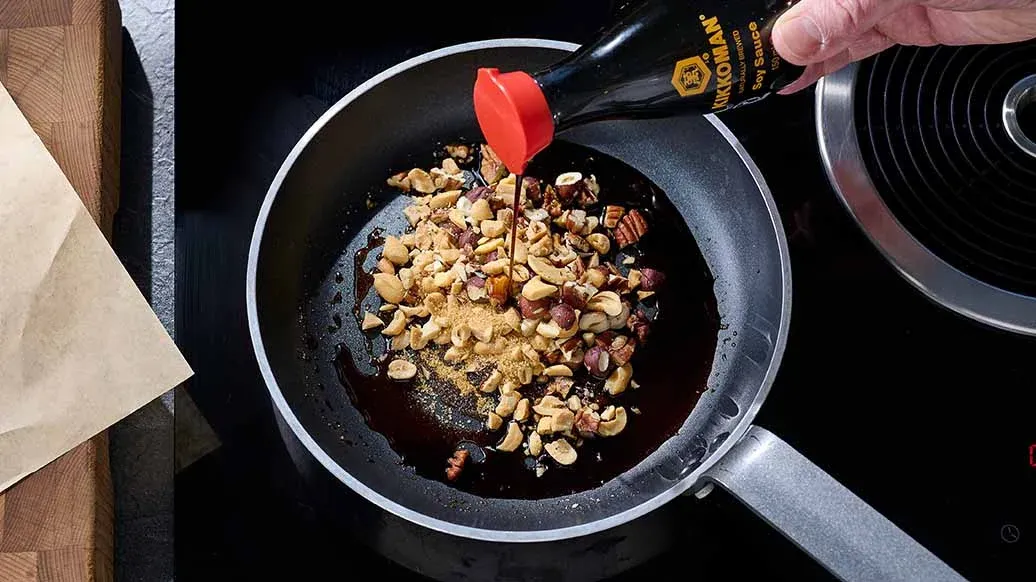 50 г смеси орехов, например кешью, фундука, пекана, арахиса – 3 ст. л. соевого соуса натурального брожения Kikkoman – 1 ч. л. коричневого сахара