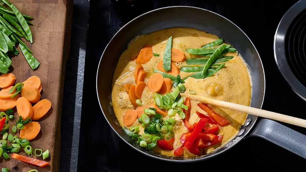 Популярная тайская классика с хрустящими овощами, нежной курицей и кремовым кокосовым соусом, сдобренным красной пастой карри и соевым соусом Kikkoman для идеальной остроты.