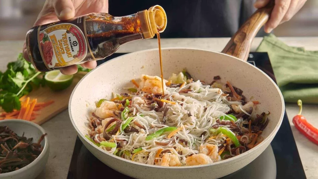 Черные тигровые креветки с рисовой лапшой, перцем, морковью и грибами мун в соусе Терияки Kikkoman с кунжутом.
