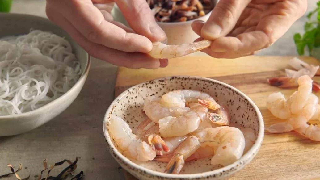 Почистите креветки, удалив панцирь. Грибы мун замочите в кипятке на 10 минут.