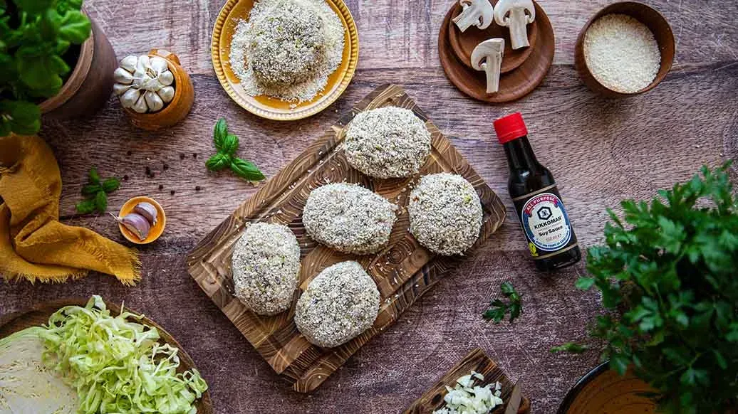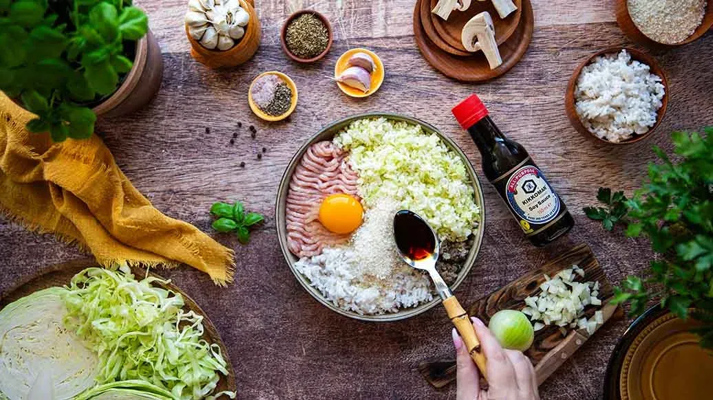 Мелко порубите чеснок. Мелко нарежьте лук и грибы и обжарьте их в разогретом масле на сковороде. Оставьте остывать и переложите в миску. Капусту измельчите в кухонном комбайне и добавьте в миску. Добавьте рис, мясо, яйцо, панко Kikkoman, чеснок, соевый соус Kikkoman и специи. Перемешайте до однородности.