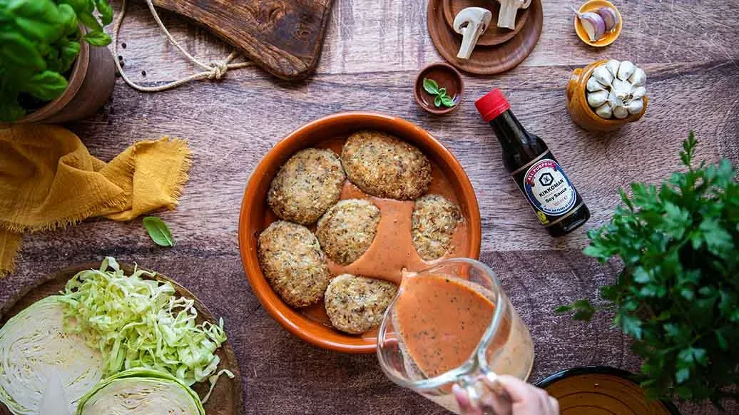 Из смеси, приготовленной в шаге 1, сформируйте 6 голубцов и обваляйте их в панко Kikkoman. Разогрейте масло в сковороде и обжарьте голубцы с обеих сторон до золотистой корочки. Переложите голубцы в форму для запекания.