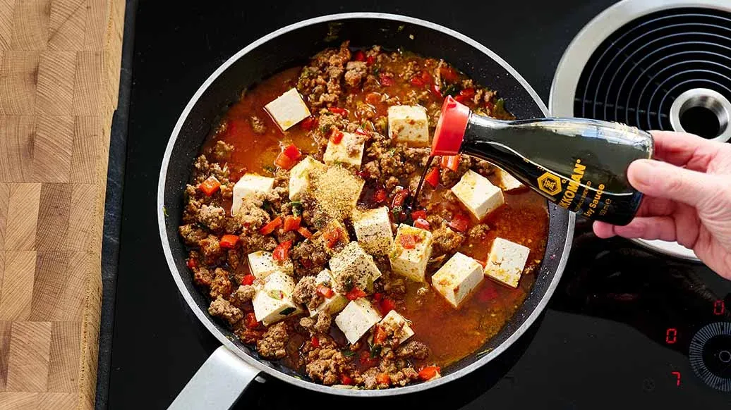 Добавьте бульон, бобовый чили соус и хорошо перемешайте. Добавьте кубики тофу и аккуратно перемешайте, чтобы не поломать их. Приправьте соевым соусом Kikkoman, сахаром и перцем и готовьте на небольшом огне около 5 минут.