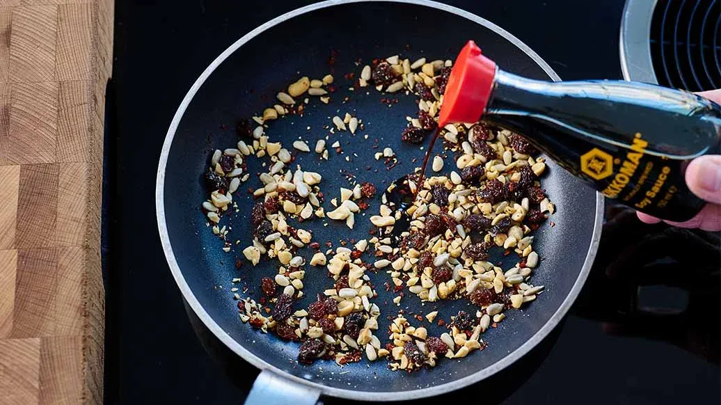 Поджарьте чили, изюм, арахис и семечки на большой сковороде. Приправьте соевым соусом Kikkoman и снимите со сковороды.