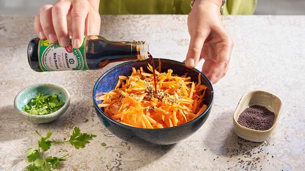 150 г моркови, крупно натертой – 1 ст. л. имбиря, нарезанного – 1 ч. л. черных семян горчицы – 2 ст. л. оливкового масла – 1 ст. л. слабосоленого соевого соуса натурального брожения Kikkoman – ½ ч. л. чили грубого помола – Несколько листьев кинзы