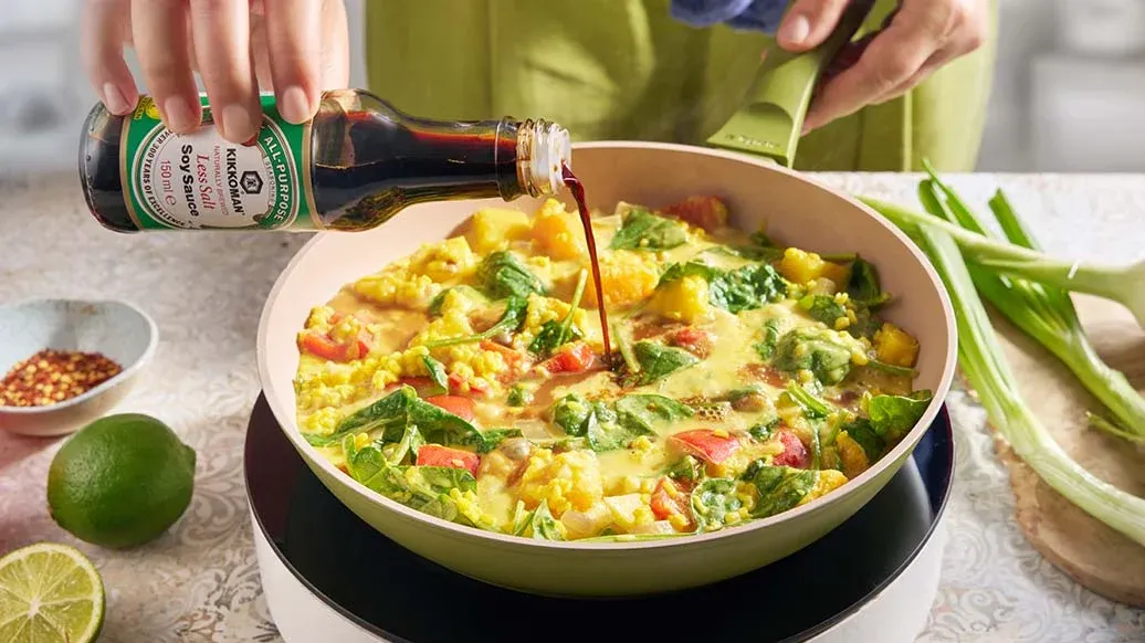 Очистите тыкву и нарежьте крупными кубиками. Отварите чечевицу с тыквой и куркумой в воде 20 минут. В сковороде обжарьте лук-шалот и красный перец в кокосовом масле 2–3 минуты, затем добавьте чеснок и имбирь и готовьте 30 секунд. Добавьте приготовленную чечевицу с тыквой, влейте кокосовое молоко и тушите 5 минут. Добавьте манго и шпинат и готовьте 1–2 минуты. Приправьте соком лайма и слабосоленым соевым соусом Kikkoman.