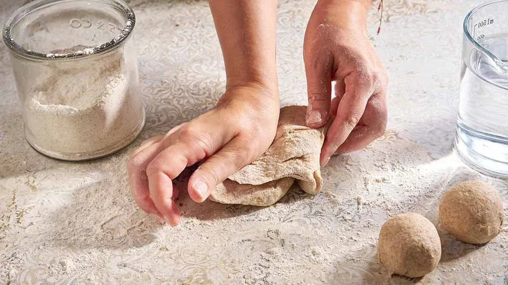 150 мл цельнозерновой муки – 20 г дополнительной муки для посыпки – 100 мл теплой воды – 20 г топленого масла (гхи)