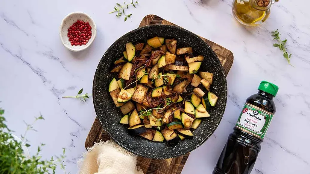 Нарежьте камамбер слайсами и отложите в сторону. Нарежьте баклажан и кабачок кубиками, а лук – соломкой. Разогрейте 1 ст. л. оливкового масла, обжарьте овощи, затем добавьте слабосоленый соевый соус Kikkoman, тимьян и перец.