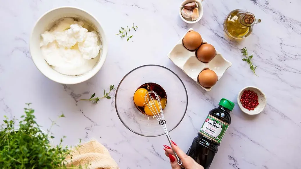 4 яйца – 1 ст. л. слабосоленого соевого соуса натурального брожения Kikkoman – 2 ч. л. шрирачи – 1 зубчик чеснока, мелко рубленый – 1 ст. л. оливкового масла
