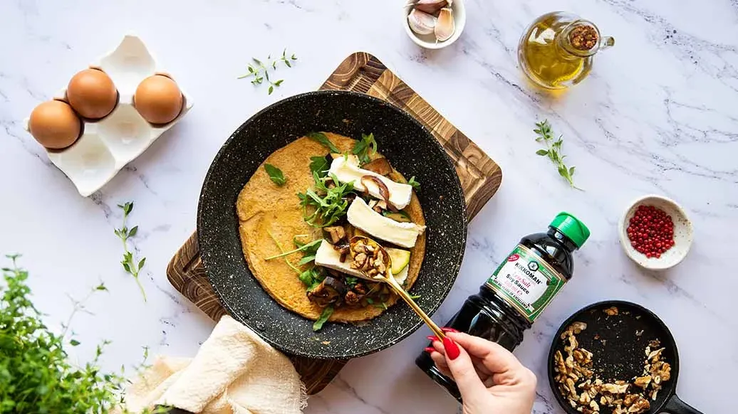 Нежный омлет с начинкой из баклажанов, кабачков и плавленого камамбера, с добавлением соевого соуса Kikkoman для большей глубины вкусы. Простой в приготовлении и идеальный рецепт для обеда или лёгкого ужина.