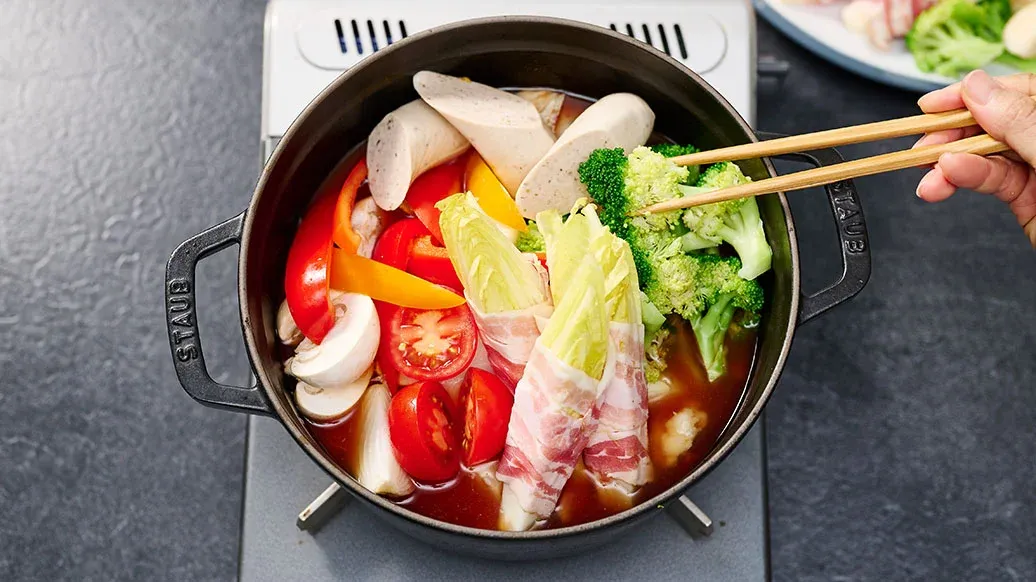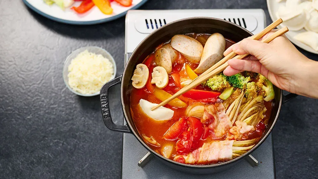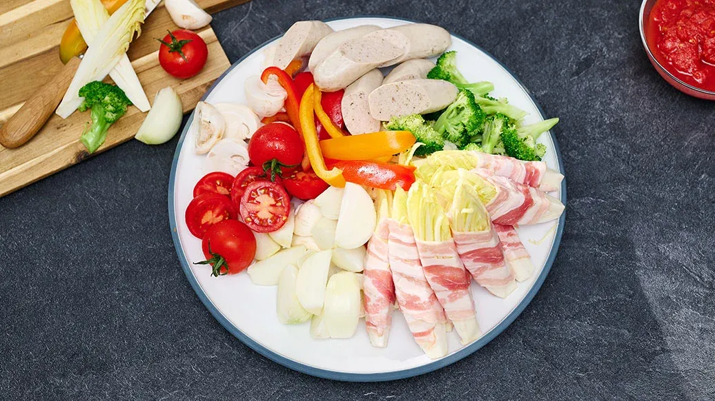 Простой хот-пот с пикантными томатами и остротой чили соуса Кимчи Kikkoman. Копчёный бекон, сосиски и расплавленный сыр добавят ему насыщенный вкус умами. Наш хот-пот быстро готовится и идеален для большой компании.