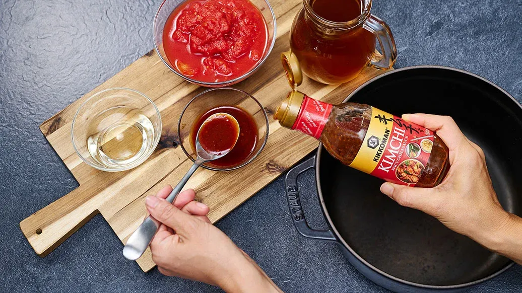 Смешайте куриный бульон, консервированные резаные томаты, белое вино и чили соус Кимчи Kikkoman в кастрюле. Доведите до кипения, чтобы получить основу для супа.