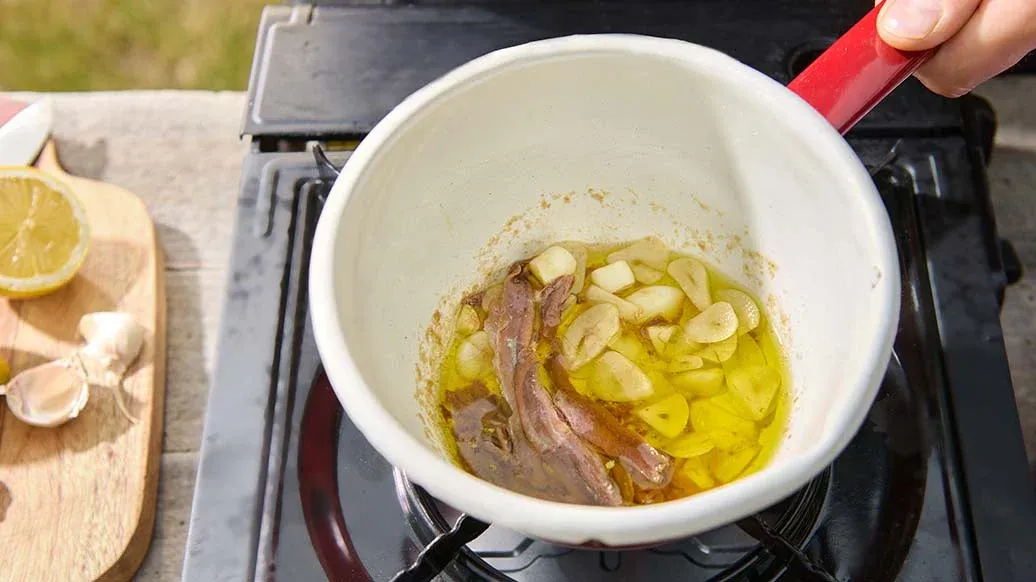 Нагрейте оливковое масло в небольшом сотейнике на среднем огне. Добавьте чеснок и филе анчоусов. Готовьте, часто помешивая, в течение 7–8 минут, пока чеснок не даст аромат, а анчоусы не растворятся в масле. Снимите с огня, пюрируйте ручным блендером или измельчите в ступке и отложите в сторону.